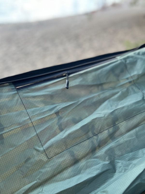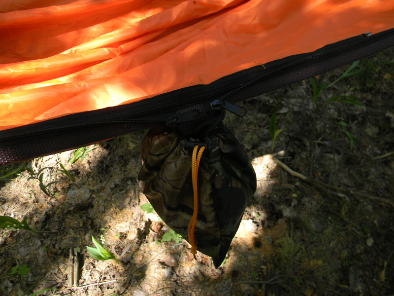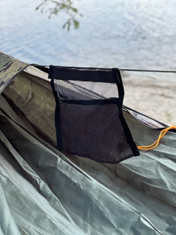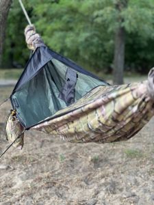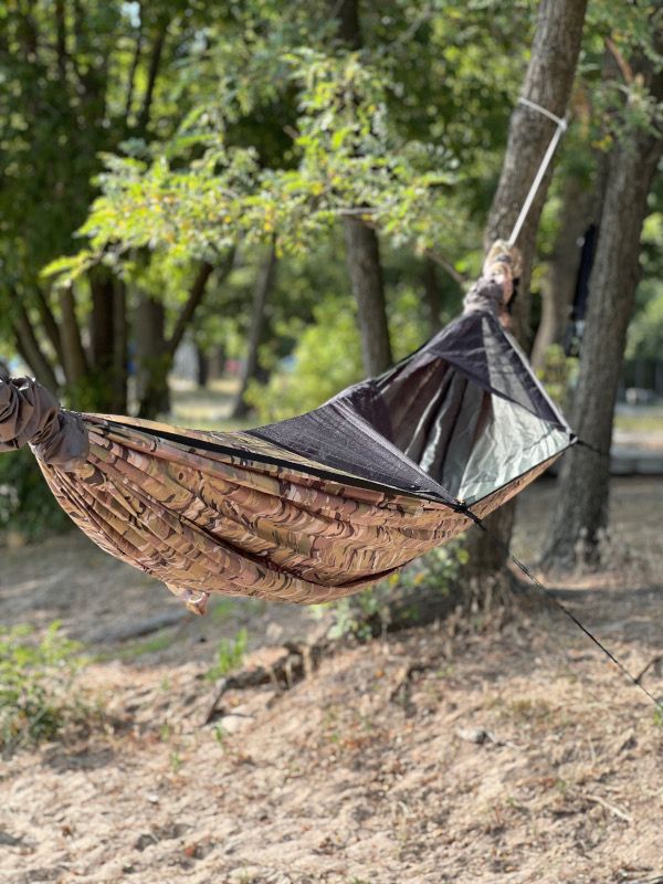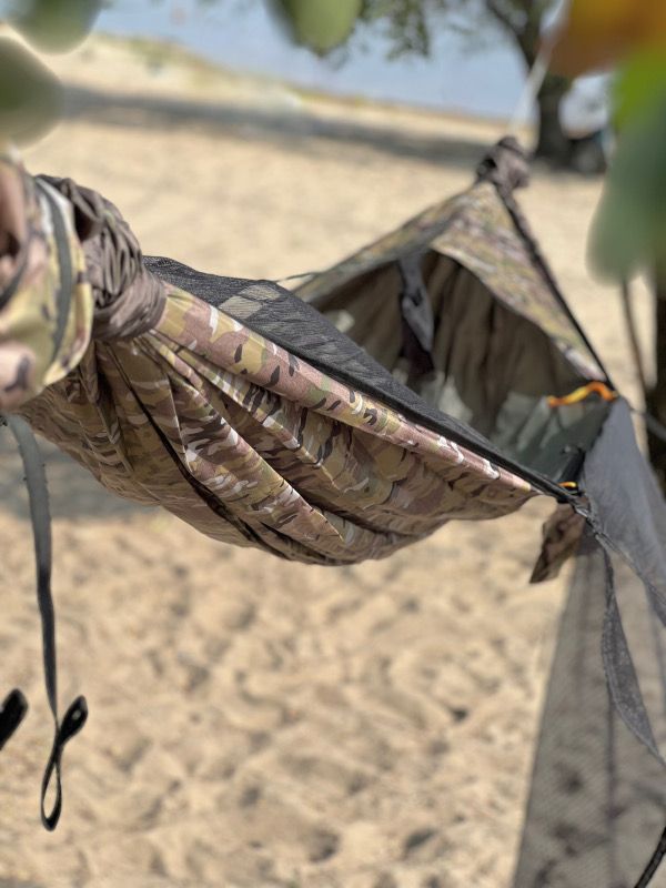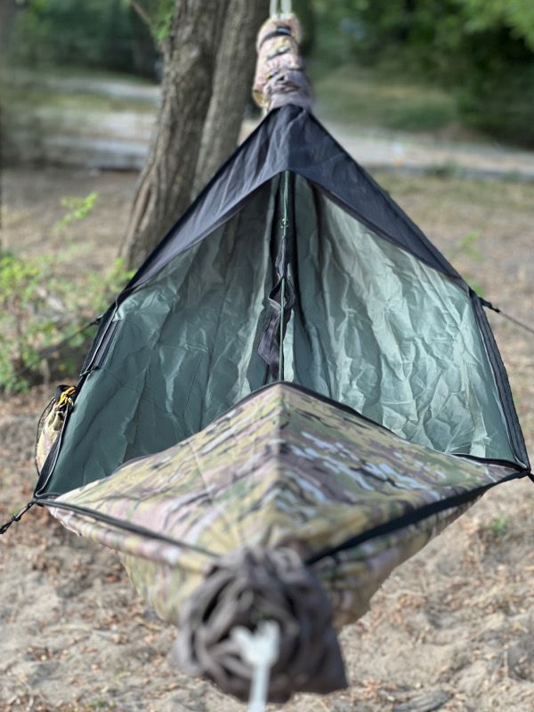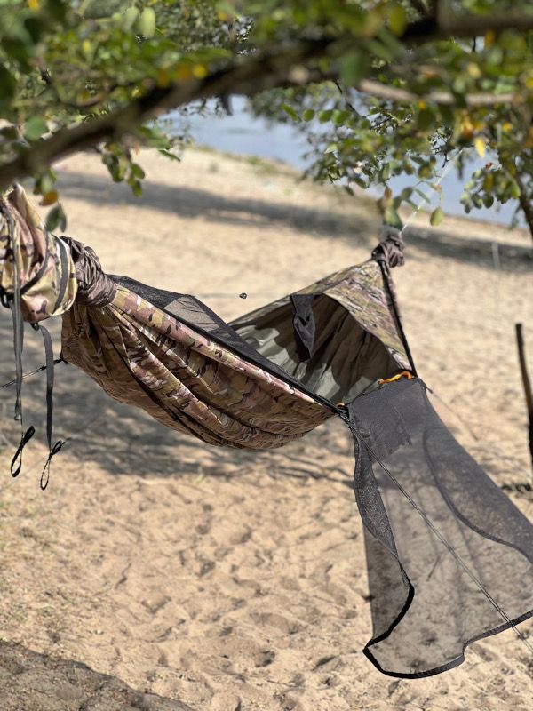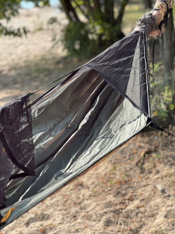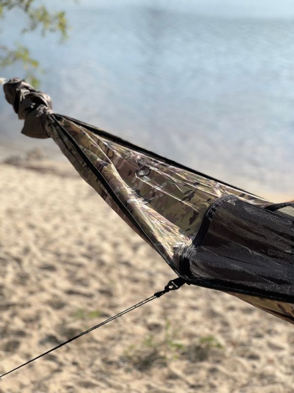 Москітна сітка ховається в спеціальну підвісну зовнішню кишеню. Також є внутрішня кишеня на блискавці, вшита в центральній частині гамака.