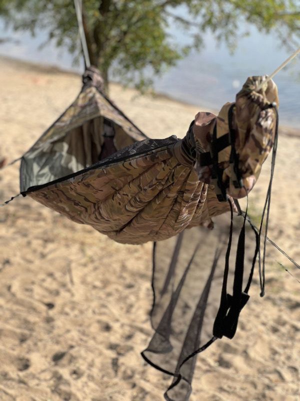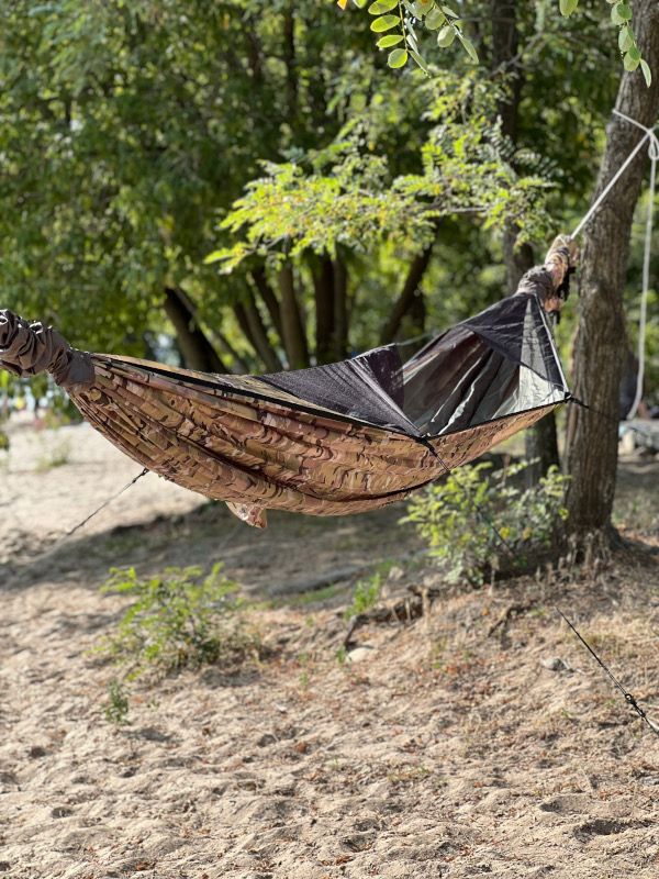 Гамак повністю зібраний: нижче наведені елементи підв'язані до своїх точок кріплення, що значно скорочує час установки гамака Piligrim.