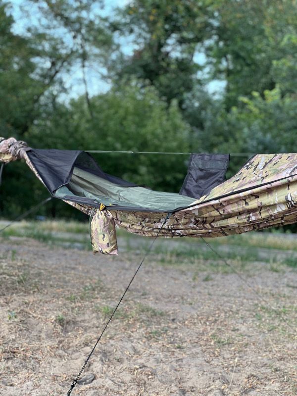 Москітна сітка ховається в спеціальну підвісну зовнішню кишеню, ще є внутрішня кишеня на блискавці, вшита в центральній частині гамака.