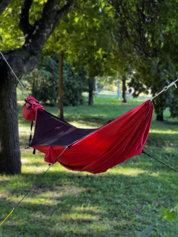 Гамак Skitalec повністю зібраний, підвіси з карабінами зав'язані, діагональні розтяжки пройняті в півкільця. Прив'язуєте гамак до двох опорних точок (дерево, стовп і т.д.), і кріпіть розтягування до землі.