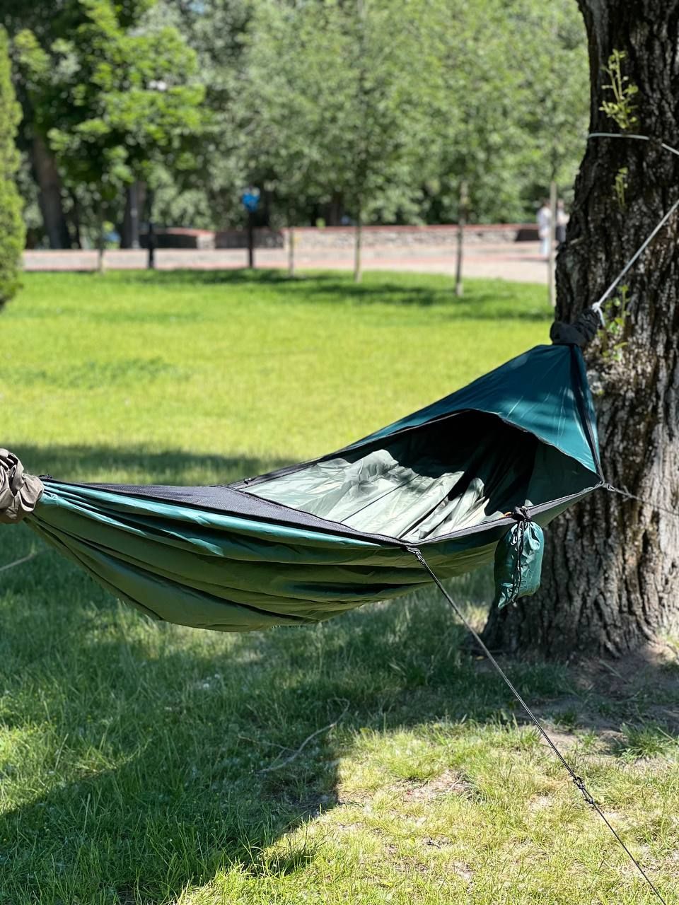 Гамак повністю зібраний: Нижче наведені елементи підв'язані до своїх точок кріплення, що значно скорочує час установки гамака Skitalec.