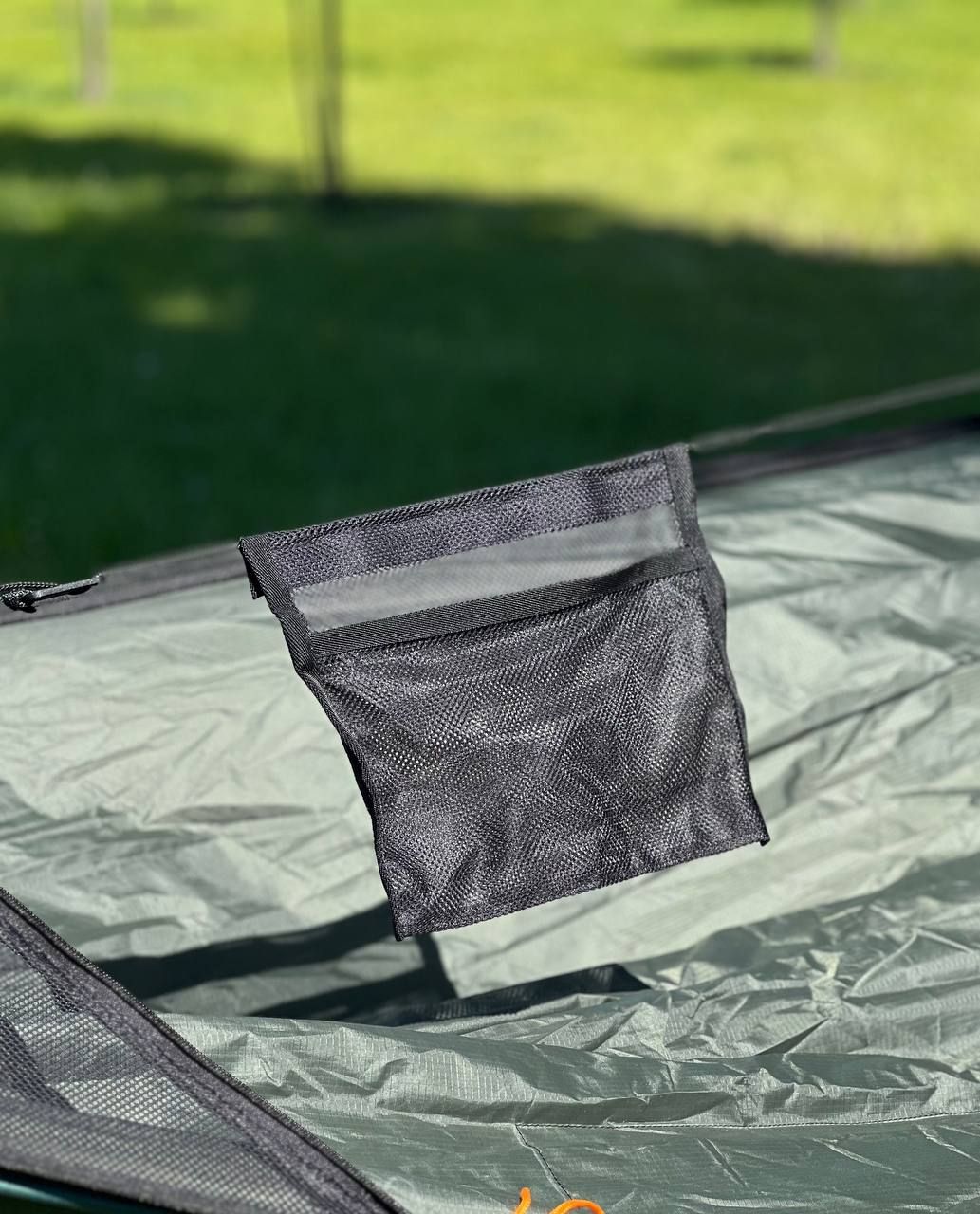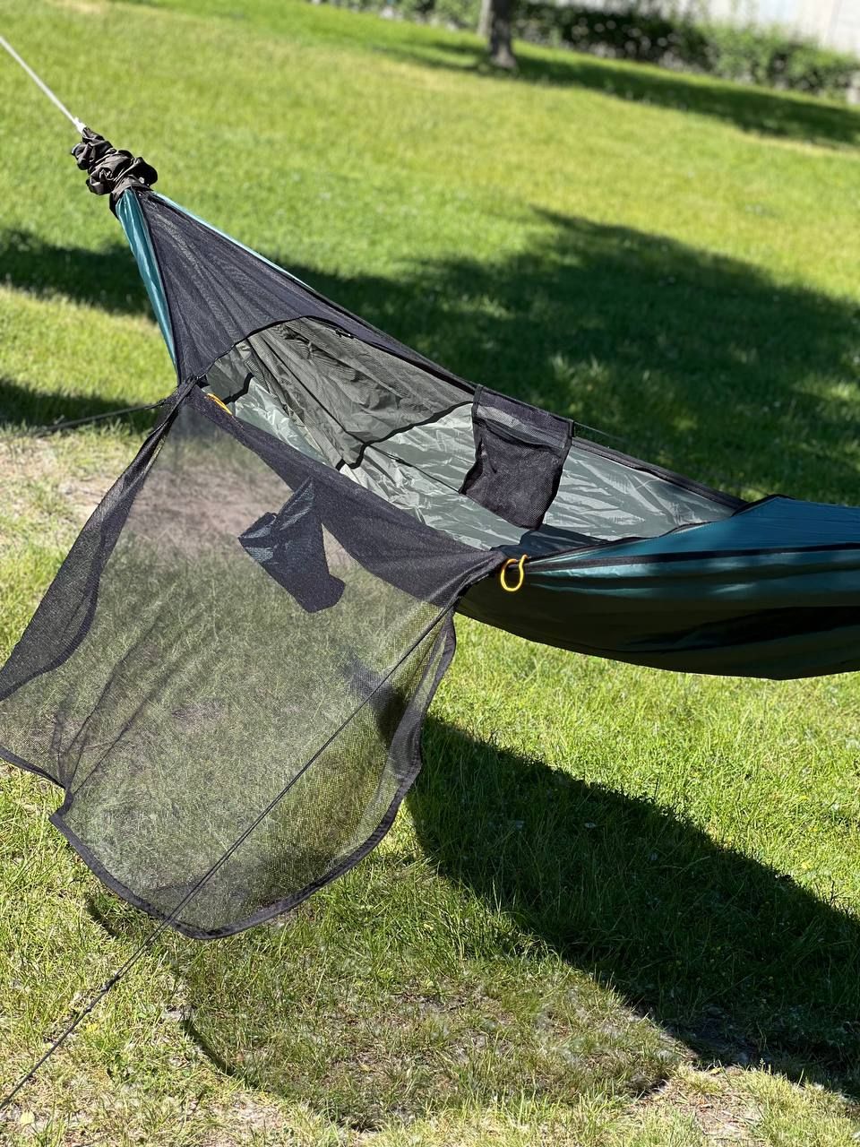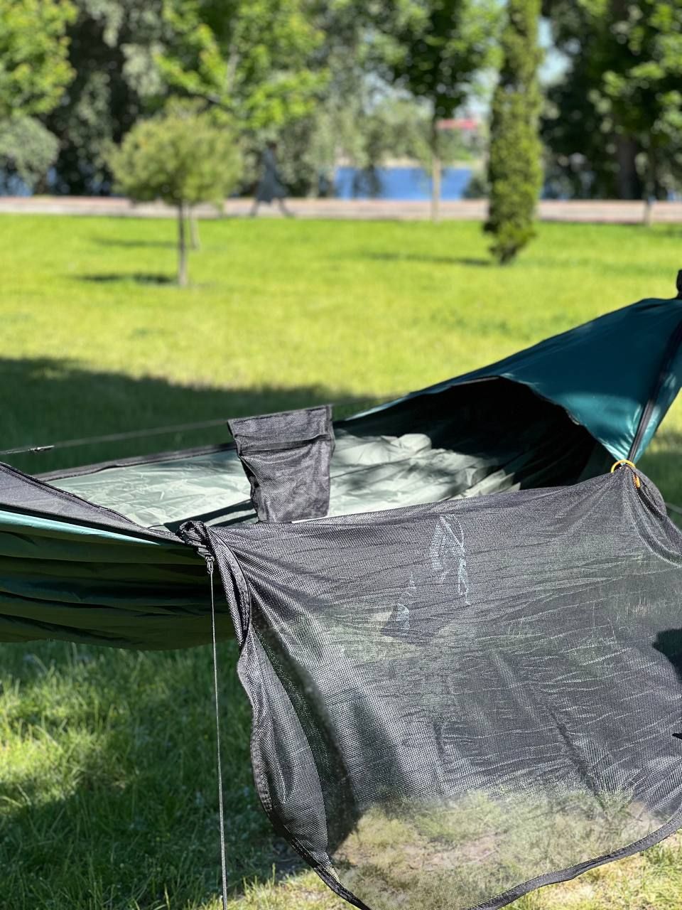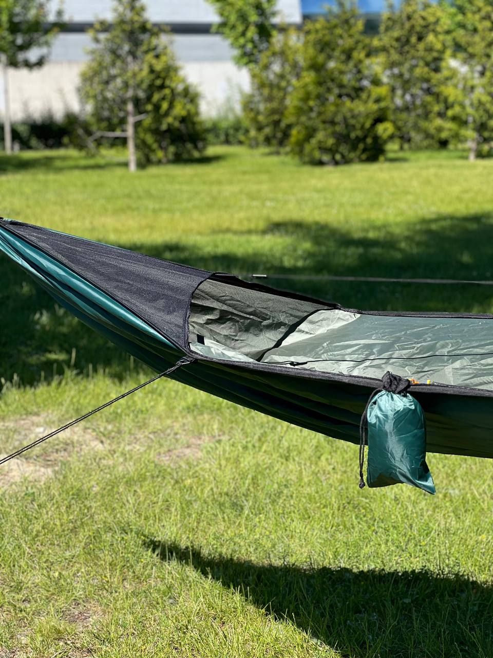 Москітна сітка ховається в спеціальну підвісну зовнішню кишеню. Також є внутрішня кишеня на блискавці, вшита в центральній частині гамака.