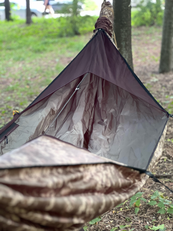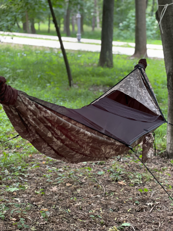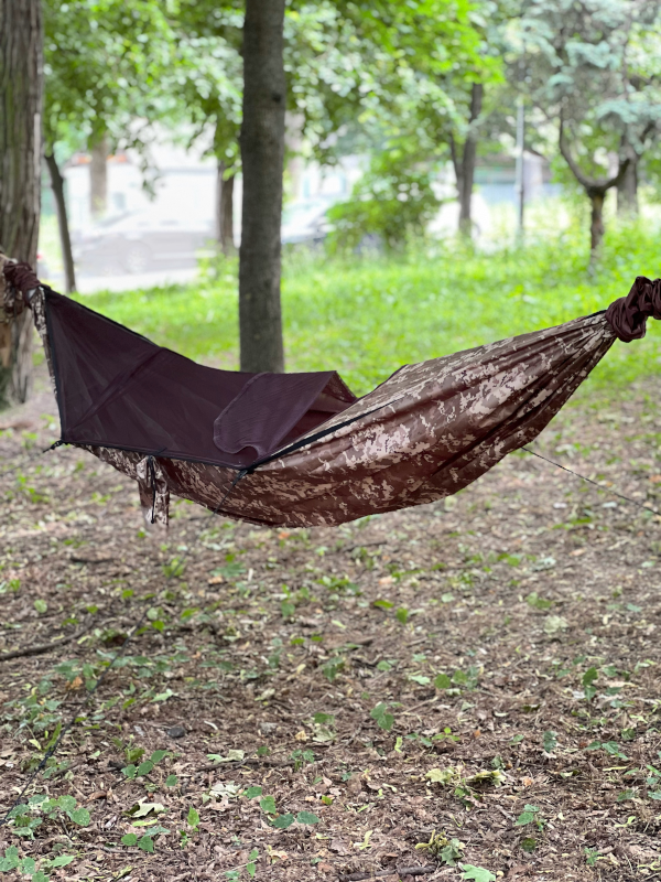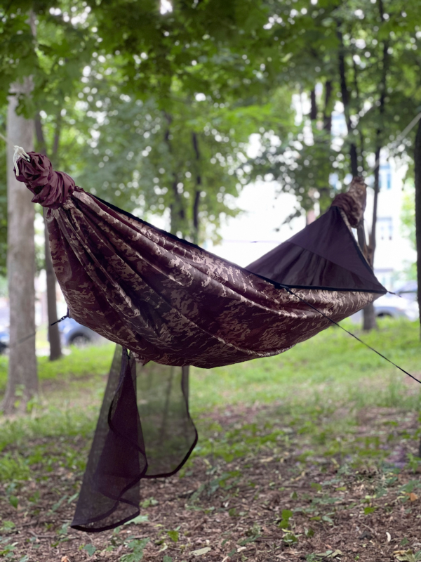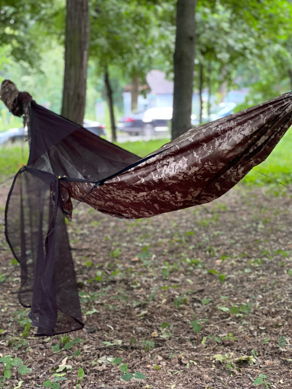 Москітна сітка ховається в спеціальну підвісну зовнішню кишеню. Також є внутрішня кишеня на блискавці, вшита в центральній частині гамака.