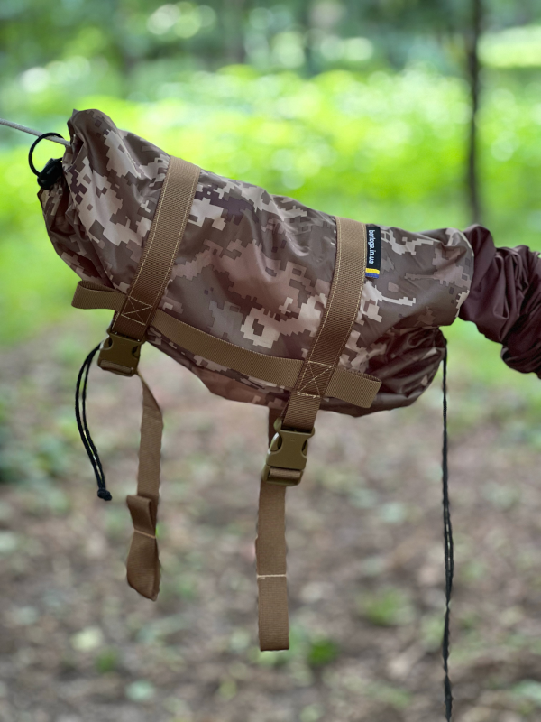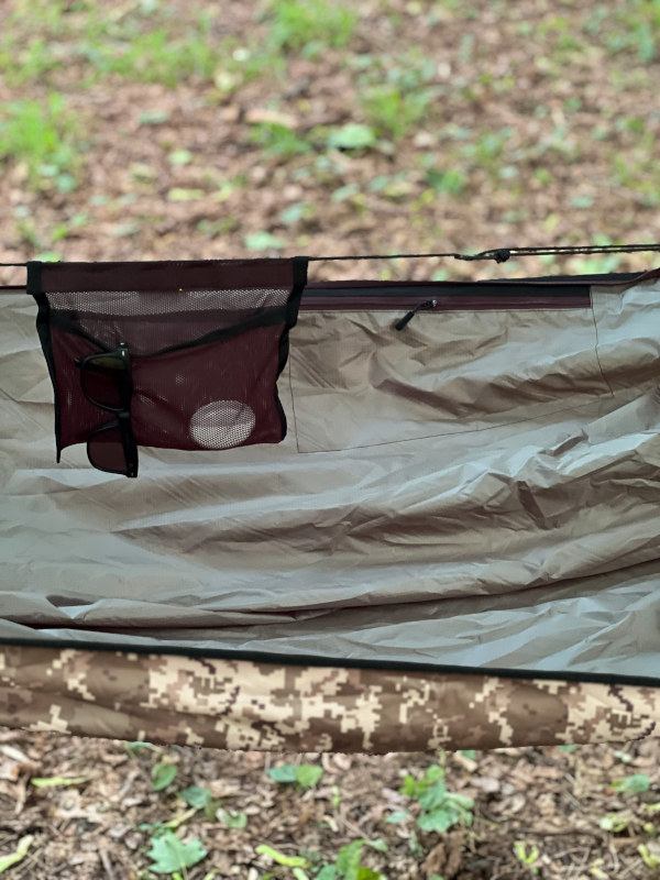Москітна сітка ховається в спеціальну підвісну зовнішню кишеню, ще є внутрішня кишеня на блискавці, вшита в центральній частині гамака.