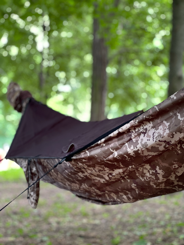 Гамак повністю зібраний: нижче наведені елементи підв'язані до своїх точок кріплення, що значно скорочує час установки гамака Piligrim.