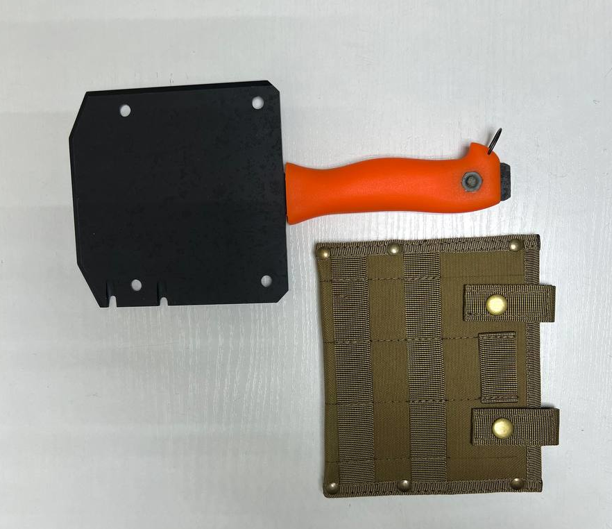 Піхви - кордура зі вставками з спеціального пластика. Система MOLLE з обох сторін. Дозволяє як монтувати лопатку на пояс, розгрузку,#nbsp;рюкзак ззовні, так і монтувати на фронтальну сторону піхов інші підсумки. Піхви дозволяють вставляти клинок будь-якою стороною. Ремінці, обмежувачі, застібки відсутні. Клинок тримається всередині силою тертя абсолютно надійно, а виймається чи повертається в піхви без додаткових рухів.